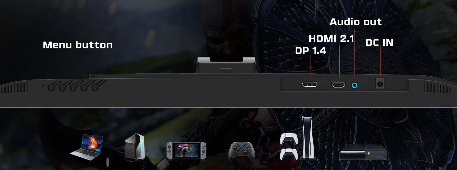 Equipped with dual HDMI 2.1 and DisplayPort 1.4, our monitor provides multiple connectivity options for your gaming consoles, PCs, and audio devices. Effortlessly switch between inputs and enjoy high-definition content from various sources.